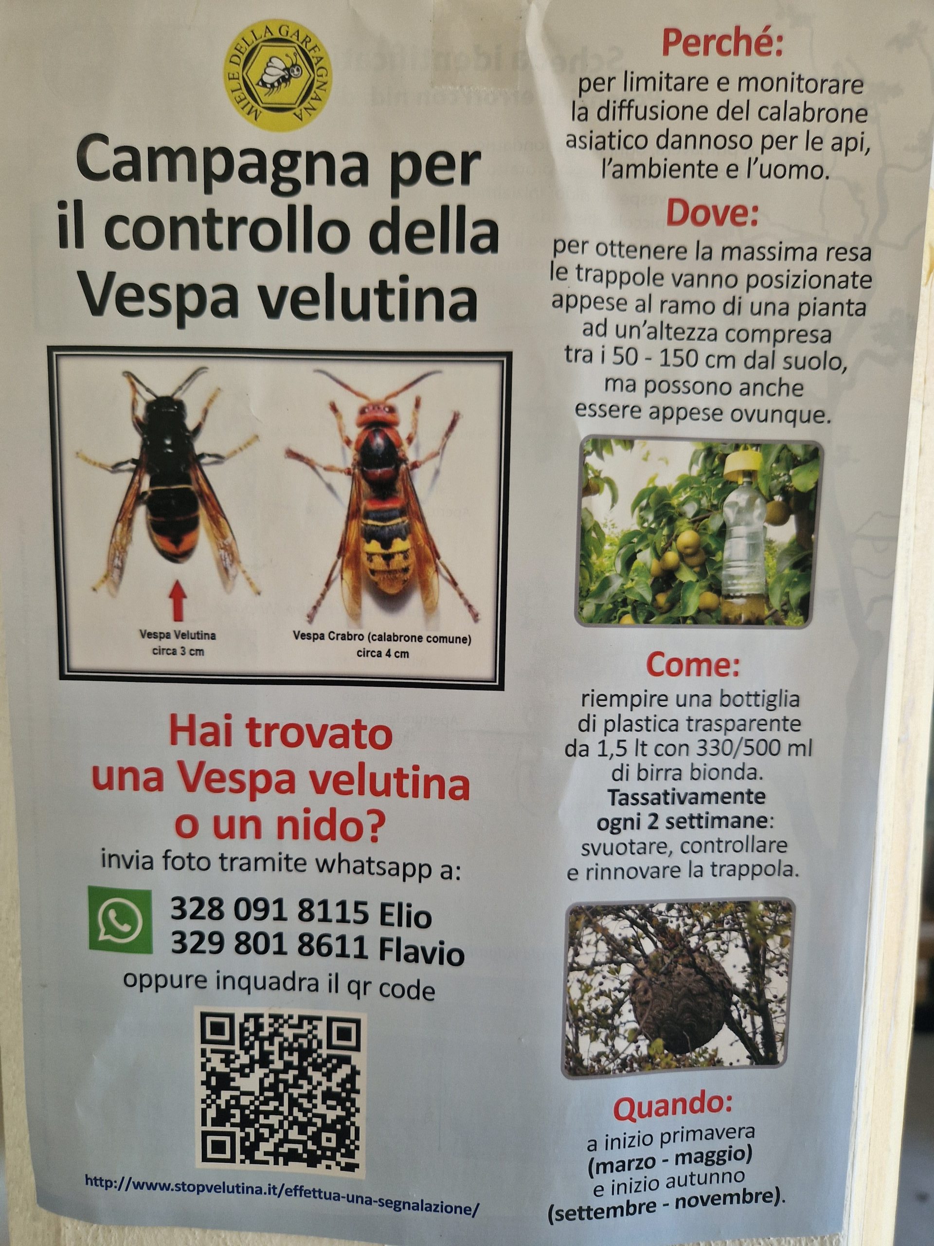Per quanto riguarda la vespa velutina seguirei le indicazioni presenti sul sito https://www.stopvelutina.it/,
