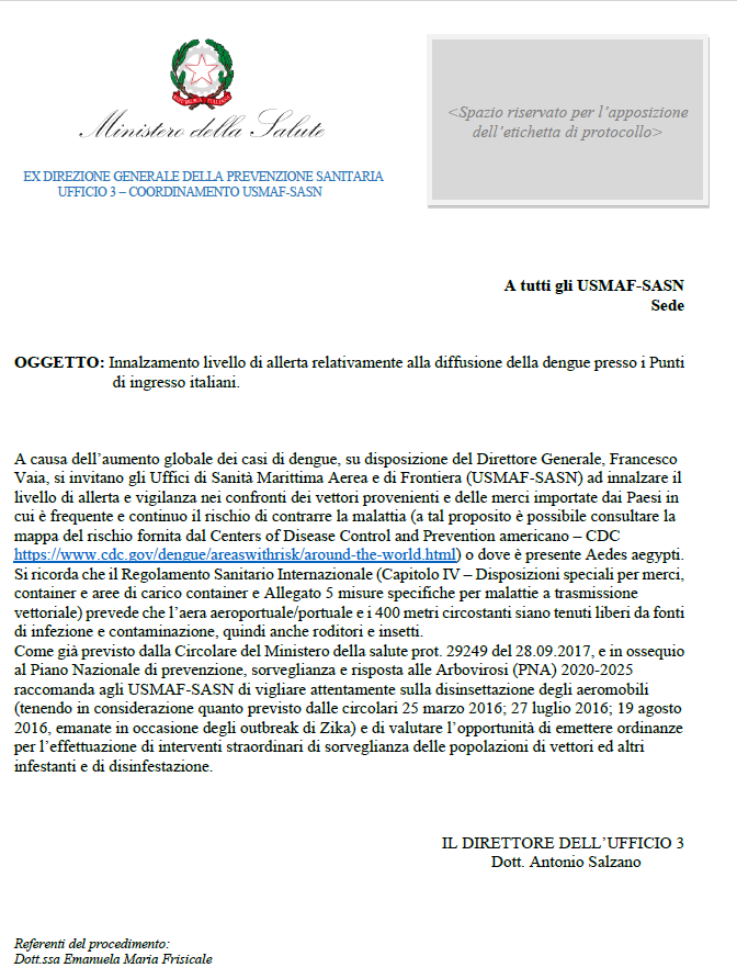 E’ di pochi giorni fa la notizia che per la Febbre Dengue si sono attivati specifici controlli come descritto su navi e aerei per impedire l’arrivo delle zanzare che trasmettono la malattia” (Corriere.it).