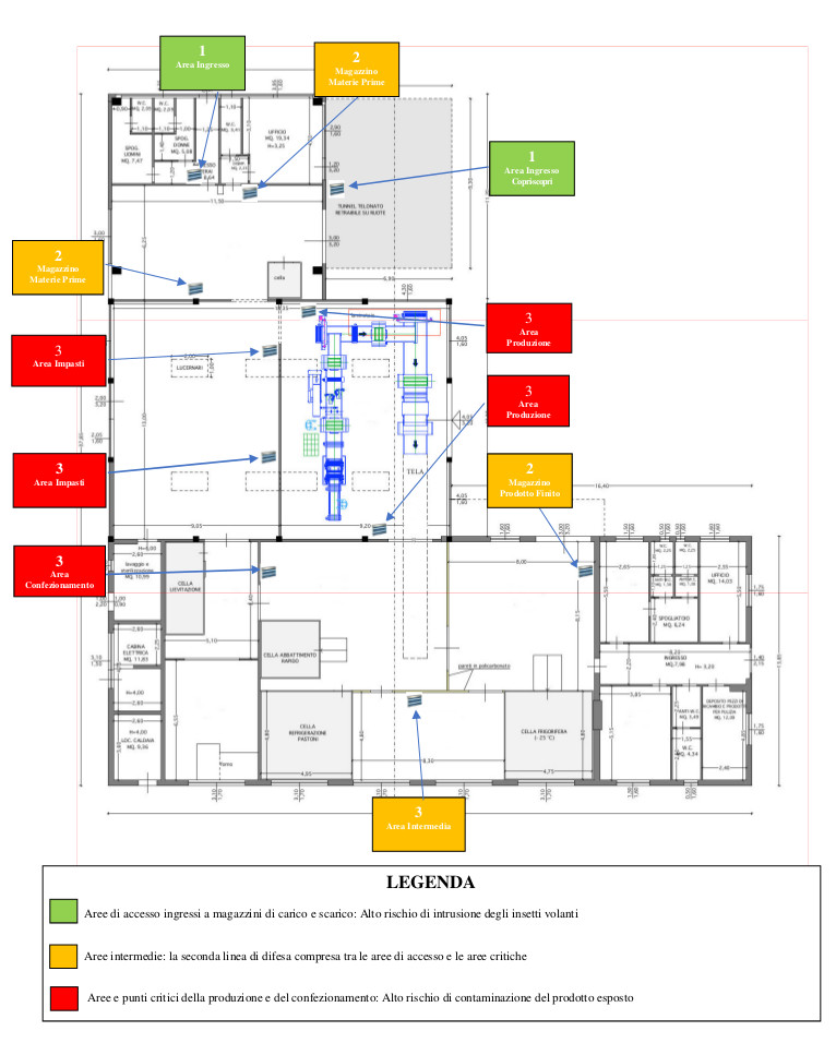 E’ pacifico che in genere la gravità aumenta mano a mano che ci avviciniamo alle aree produttive interne, anche se vi sono molte variazioni da caso a caso, dovute per esempio alla tipologia di struttura produttiva (poichè a volte vi è una soluzione di continuità tra le diverse aree) oppure a seconda del tipo di monitoraggio: in certi casi deve essere esclusa l’area esterna, vedi l’esempio sottoriportato relativo ad un servizio di monitoraggio degli insetti volanti che non viene eseguito nelle aree esterne.