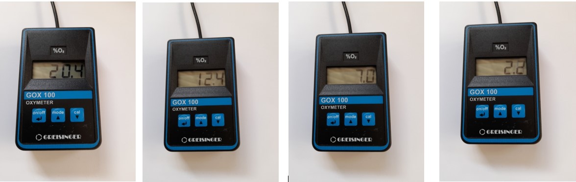 Avviato il macchinario che produce Azoto in purezza si procede al monitoraggio del contenuto di Ossigeno all’interno della bolla, che deve progressivamente diminuire.