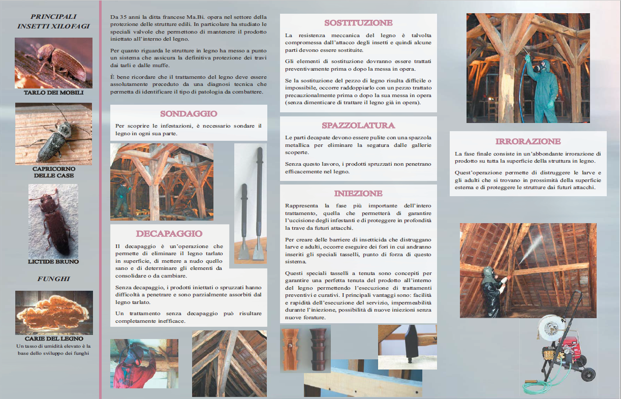 Romani Disinfestazioni Srl utilizza il sistema MABI basato sull’iniezione profonda di prodotti insetticidi Antitarlo all’interno del legno in opera, come ad esempio Travi e Travicelli di Appartamenti e Soffitte.